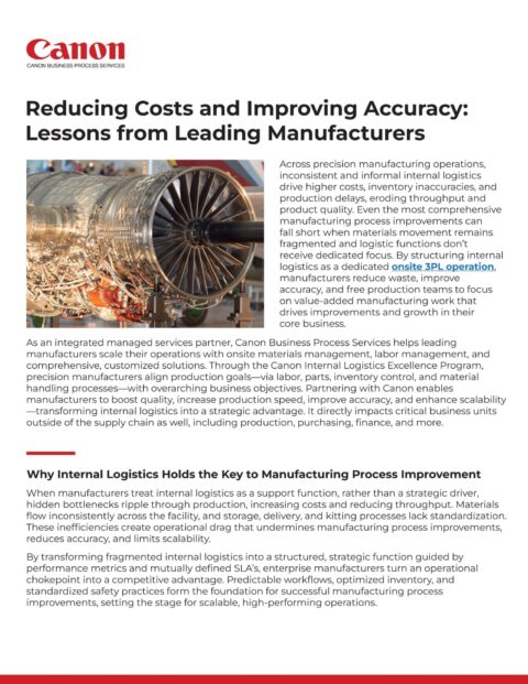 In this whitepaper, Reducing Costs and Improving Accuracy: Lessons from Leading Manufacturers, discover how precision manufacturers are unlocking performance gains by transforming internal logistics into a structured, high‑performing operation. Learn why even the best manufacturing process improvements stall when material movement, inventory control, and line delivery lack standardization—and how an onsite, metrics‑driven approach can reverse that trend.